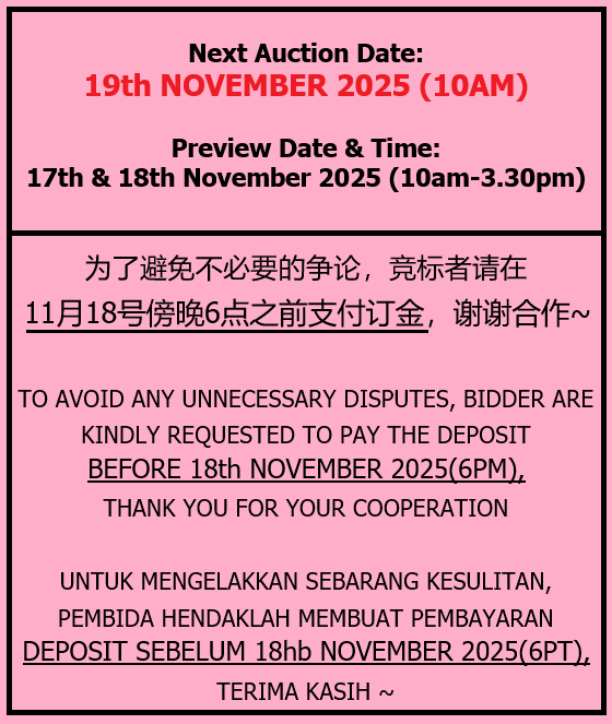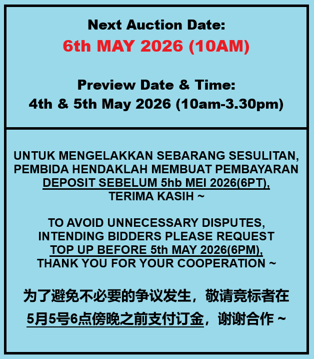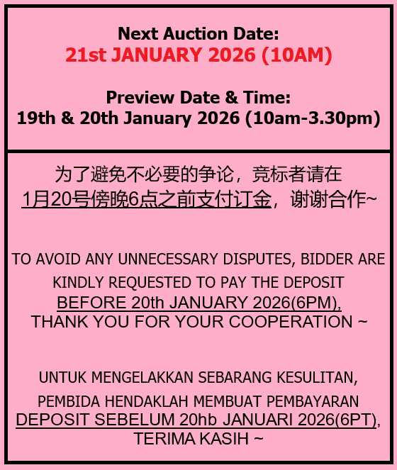 Batu Caves(KSL Sg.Tua)-Head Quarters! Next Auction Date:10 JAN 2018(Wednesday 3:00pm)/KSL(Johor Bahru) Warehouse! Next Auction Date:23 DEC 2017(Saturday 11.00am)